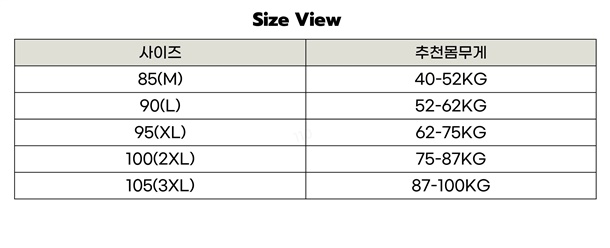 85(M),90(L),95(XL),100(2XL),105(3XL)